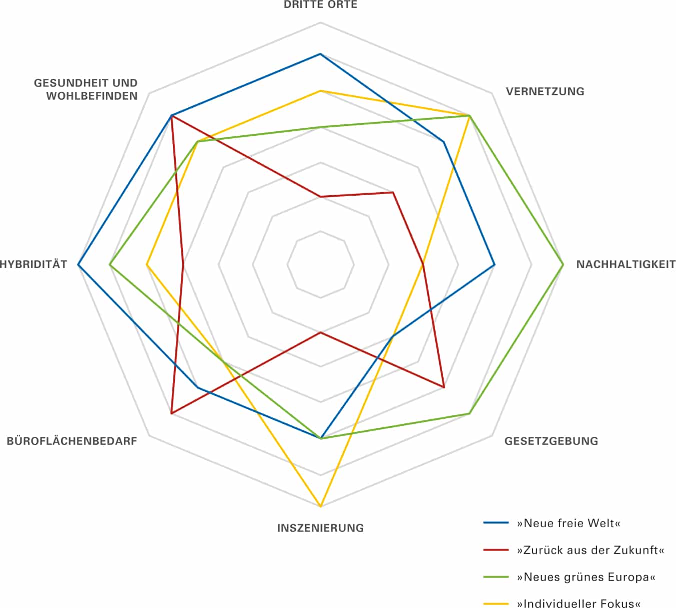 Erlebnis- und werteorientiert, maximal flexibel: Arbeit ist multilokal, die Grenzen zwischen Büro und Privat werden fließender, Technologien ermöglichen permanente Vernetzung. Gesetzlich verankerte Individualfreiheit bei der Arbeitsgestaltung prägt den Alltag. Die Folgen: hohe Mobilität, starke Inszenierung, variable Flächen.